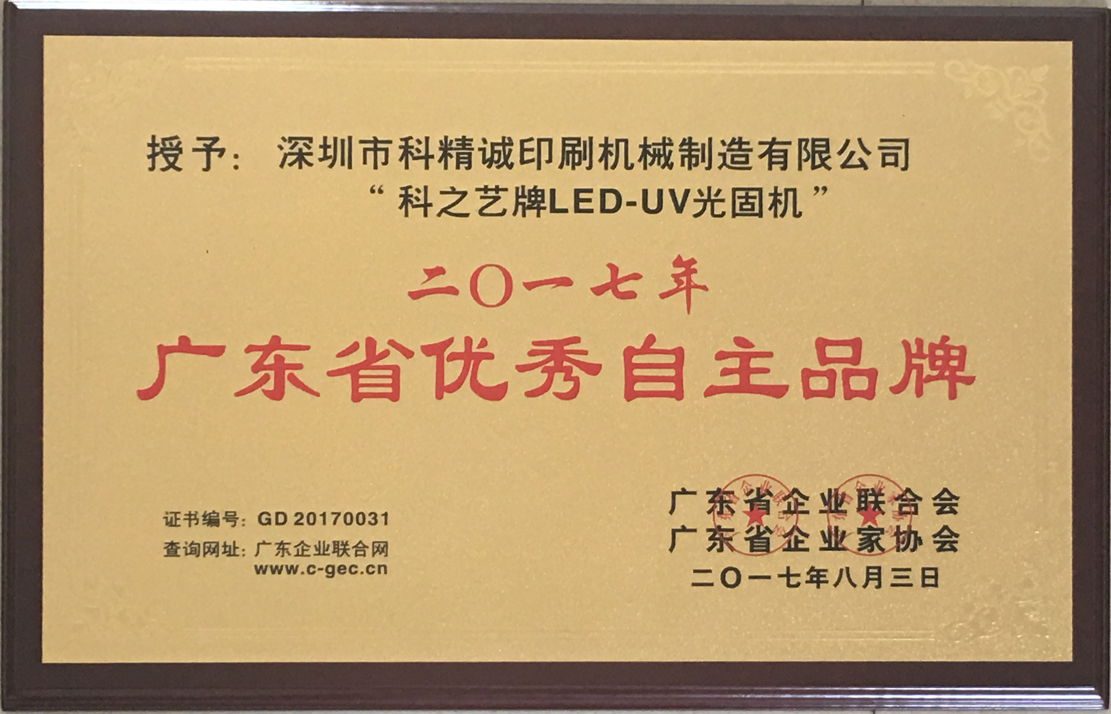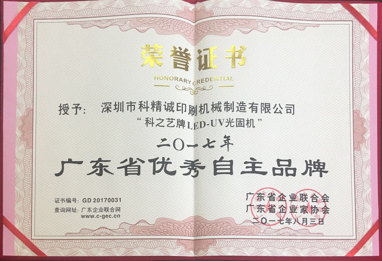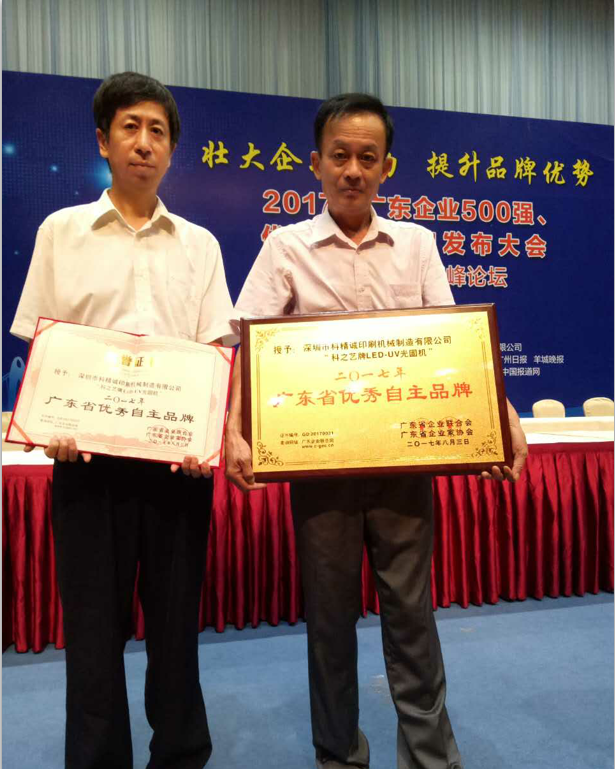 2017年8月3日,由廣東省企業(yè)聯(lián)合會(huì)、廣東省企業(yè)家協(xié)會(huì)舉行的廣東企業(yè)500強(qiáng)、優(yōu)秀自主品牌發(fā)布會(huì)中,深圳市科精誠(chéng)印刷機(jī)械制造有限公司旗下品牌——科之藝以卓越的表現(xiàn)從數(shù)千家品牌中脫穎而出,榮獲“2017年度廣東省優(yōu)秀自主品牌”稱號(hào)。這是對(duì)“科之藝”多年來(lái)堅(jiān)持自主創(chuàng)新,努力拼搏,持續(xù)打造產(chǎn)品核心競(jìng)爭(zhēng)力,積極培育優(yōu)秀自主品牌的高度肯定和認(rèn)可。